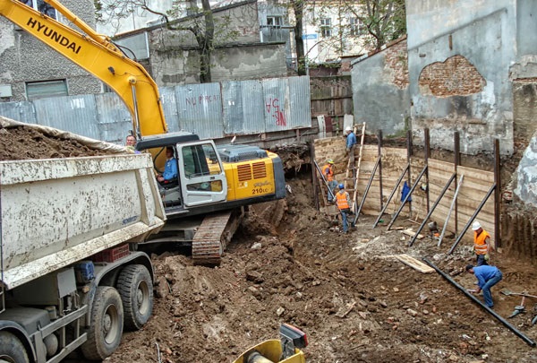 Nếu khối lượng đào đất lớn chọn giải pháp đào đất bằng máy kết hợp với sửa thủ công. Đất đào 1 phần được vận chuyển ra khỏi công trường đổ về bãi thải, một phần để lại xung quanh hố móng và các khu đất chưa khởi công để sau này lấp đất hố móng, tôn nền.